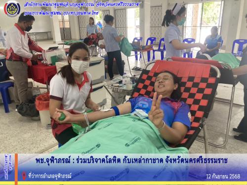 นางสาวนิชาภา ปานอ่อน พัฒนาการอำเภอจุฬาภรณ์ พร้อมด้วยเจ้าหน้าที่พัฒนาชุมชนอำเภอ ร่วมบริจาคโลหิต กับเหล่ากาชาด จังหวัดนครศรีธรรมราช โดยมี กำนัน -ผู้ใหญ่บ้าน ประธานคณะกรรมการพัฒนาสตรีตำบล มาร่วมกันบริจาคโลหิต กว่า 80 คน